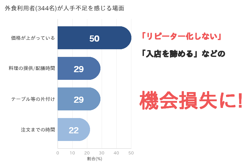人手が足りないと、サービスの品質が悪くなり、結果としてリピーターがつかず機会損失に。